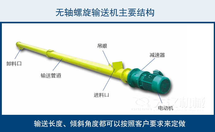 無軸螺旋輸送機可輸送傳統有軸螺旋輸送機和皮帶輸送機不能或不易輸送的物料。如顆粒狀和粉狀物料。濕的和糊狀物料。半流體和粘性物料。易纏繞和易堵塞物料。無軸螺旋輸送機有特殊衛生要求的物料。